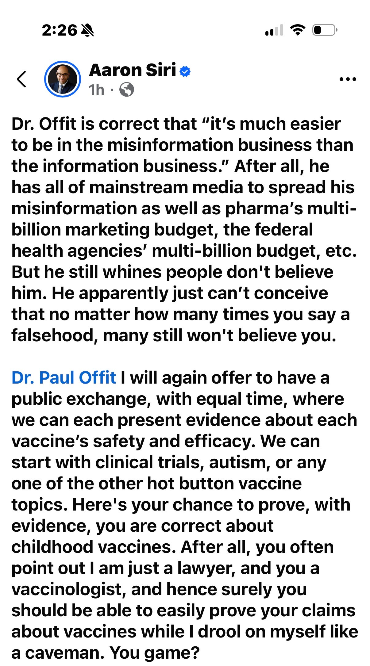Several years ago, people representing RFK Jr., who at the time was head of the anti-vaccine group, Children’s Health Defense, offered me $50,000 to debate him about the safety of vaccines. In the past week, Aaron Siri, a personal-injury lawyer whose firm represents an anti-vaccine group called Informed Consent Action Network, also asked me to debate him. As did Steve Kirsch, an entrepreneur and co-inventor of the optical mouse, who offered me $1 million if I agreed. I turned them all down because it doesn’t matter what they say during the debate. And it doesn’t matter what I say. The only thing that matters is the strength and reproducibility of the evidence.