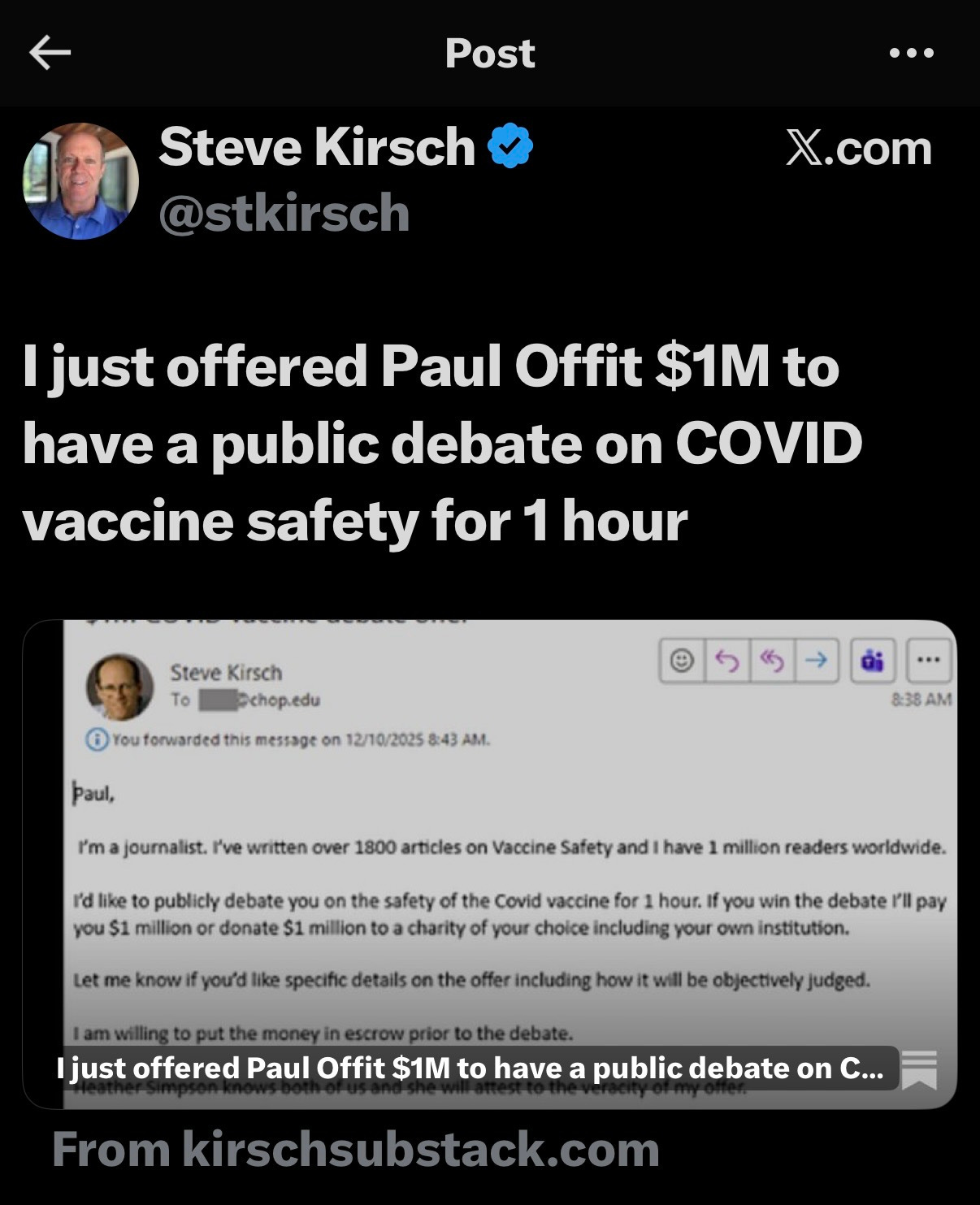 Several years ago, people representing RFK Jr., who at the time was head of the anti-vaccine group, Children’s Health Defense, offered me $50,000 to debate him about the safety of vaccines. In the past week, Aaron Siri, a personal-injury lawyer whose firm represents an anti-vaccine group called Informed Consent Action Network, also asked me to debate him. As did Steve Kirsch, an entrepreneur and co-inventor of the optical mouse, who offered me $1 million if I agreed. I turned them all down because it doesn’t matter what they say during the debate. And it doesn’t matter what I say. The only thing that matters is the strength and reproducibility of the evidence.