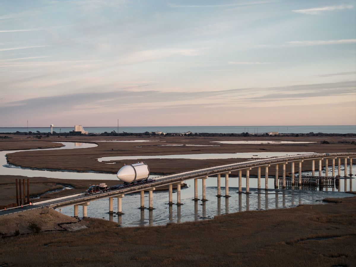 The 46-foot (14-meter) fairing made its way via barge and truck to Rocket Lab’s facilities at MARS, after departing from the company’s California test facility in December. Now that is has arrived at LC-3, the fairing will undergo pre-launch qualification testing while it awaits Neutron’s first stage.